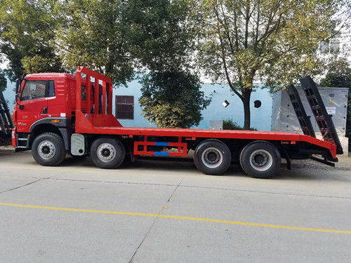 前四后八平板車配置:WP10.350E53,法士特10檔高低速,解放悍威駕駛室,13T雙后橋,300雙層大梁,1100R20鋼絲輪胎,軸距:1900+3200,3450+1350,整車尺寸:10000,11000X2500X3100,ABS,電動門窗,行車記錄儀,氣囊座椅,原廠空調.